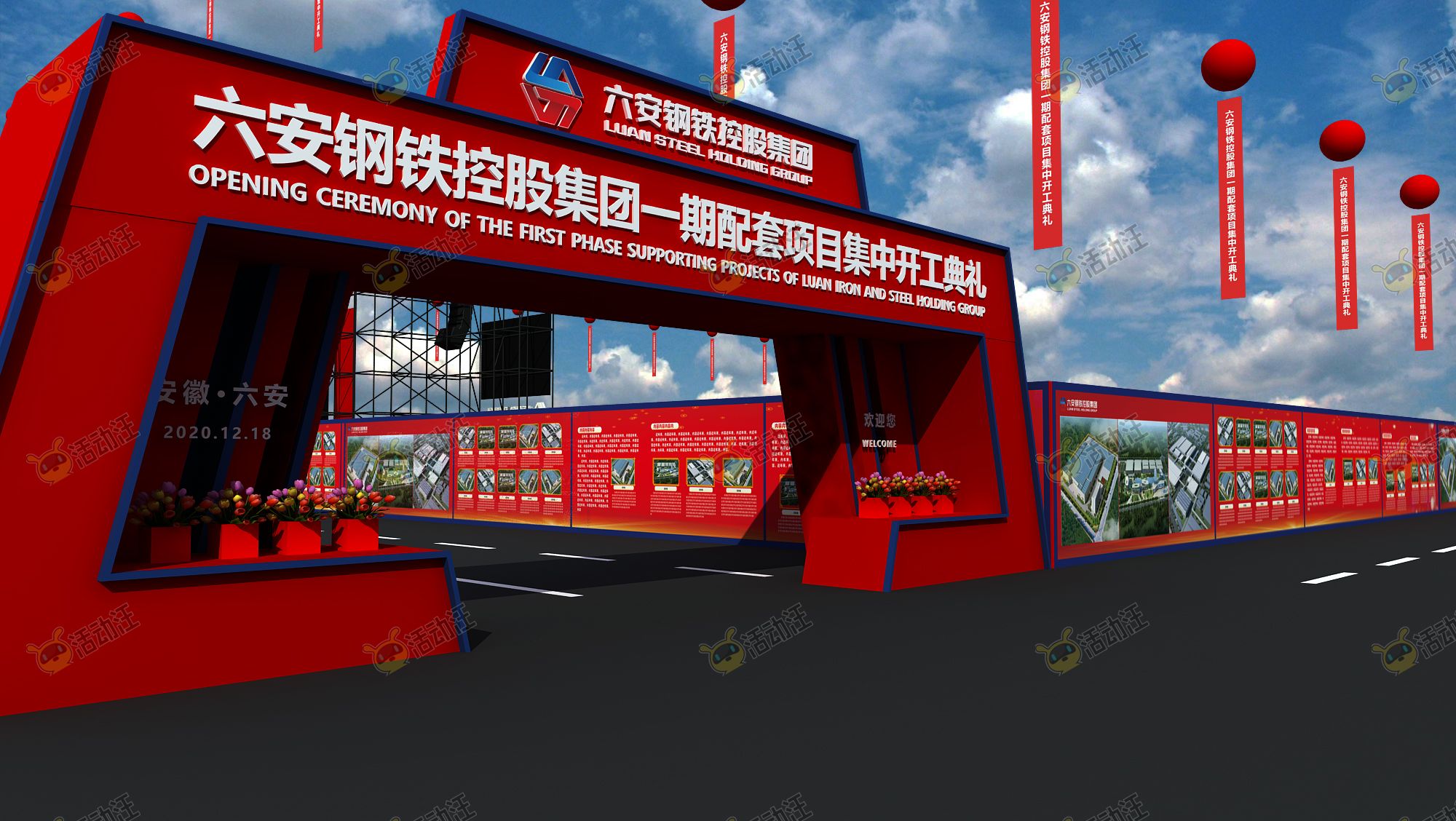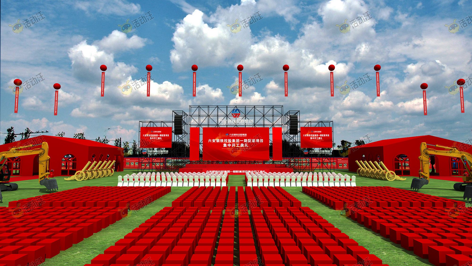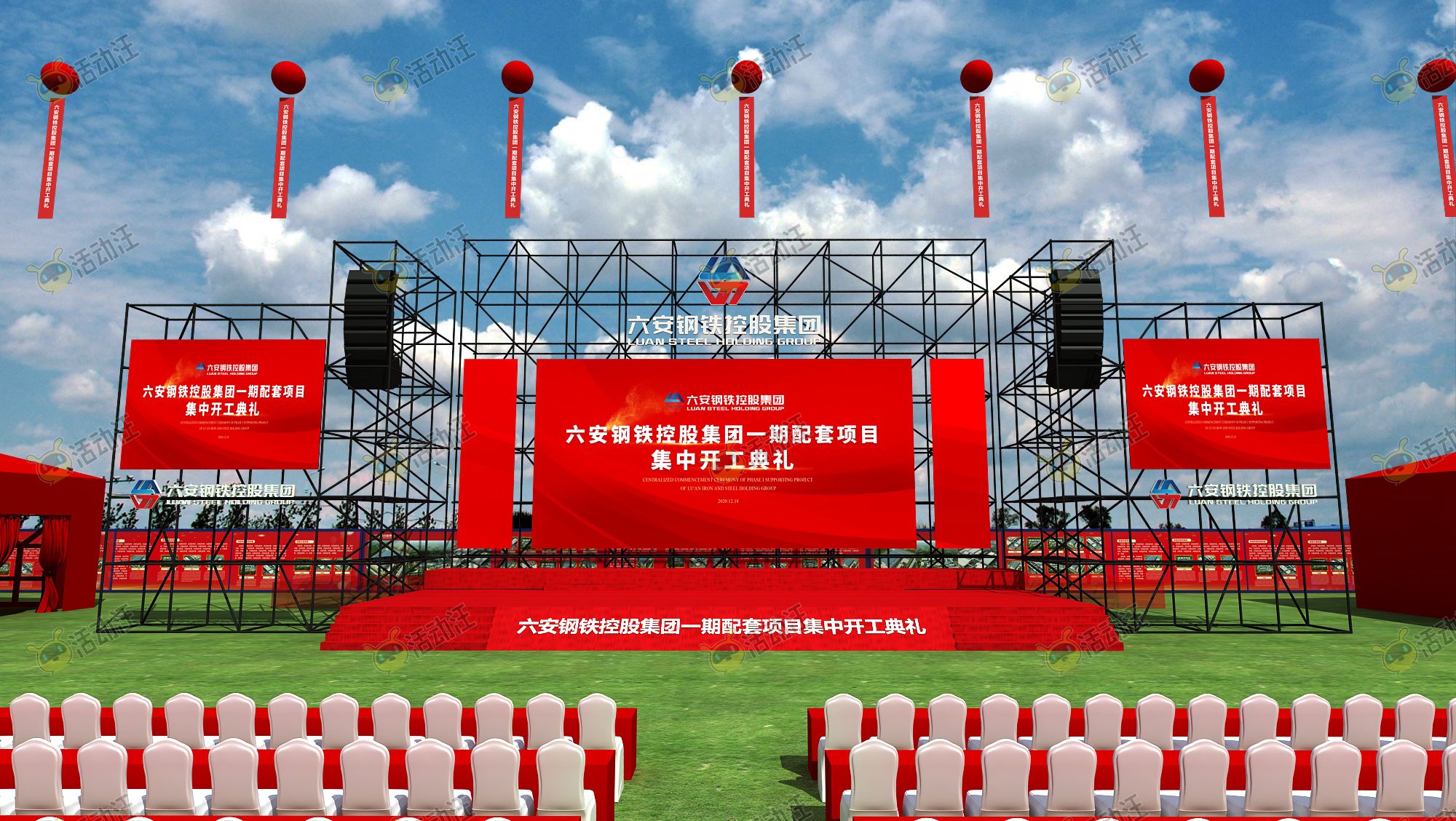 此方案为六安钢铁集团新项目开工奠基仪式,涉及多个区域的表现,有源文件和配套平面设计文件